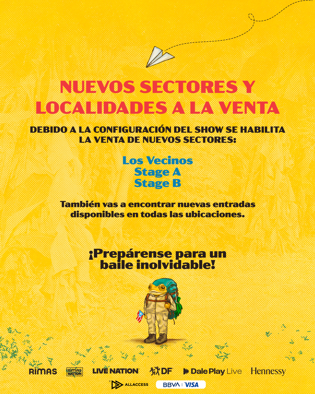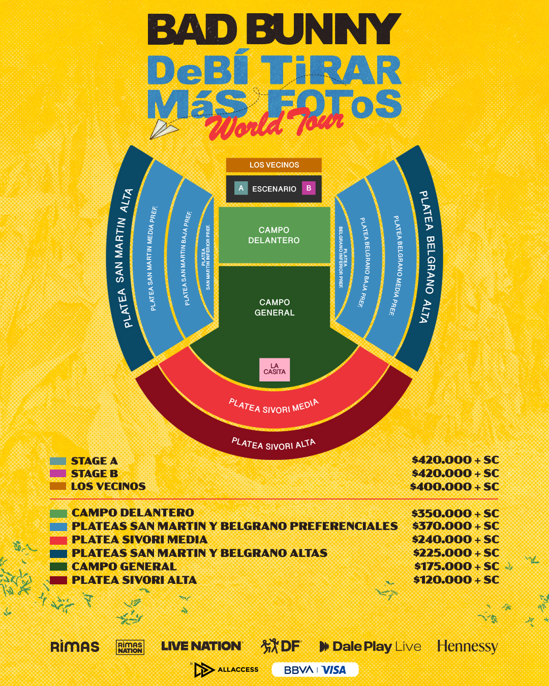 Como parte de este histórico tour Bad Bunny visitará la Argentina con tres fechas confirmadas los días 13, 14 y 15 de febrero. Debido a la configuración del show se habilitan nuevos sectores como Los Vecinos, Stage A y B, y además se podrán adquirir entradas en todas las ubicaciones para sus tres presentaciones desde el lunes 26 de enero a las 12 hs con una preventa exclusiva de 12 cuotas sin interés para clientes BBVA con tarjetas Visa. Mientras que la venta general, con todos los medios de pago y continúa el beneficio de 12 cuotas sin interés con tarjetas BBVA Visa, se habilitará el mismo día a las 16hs a través de AllAccess.com.ar.