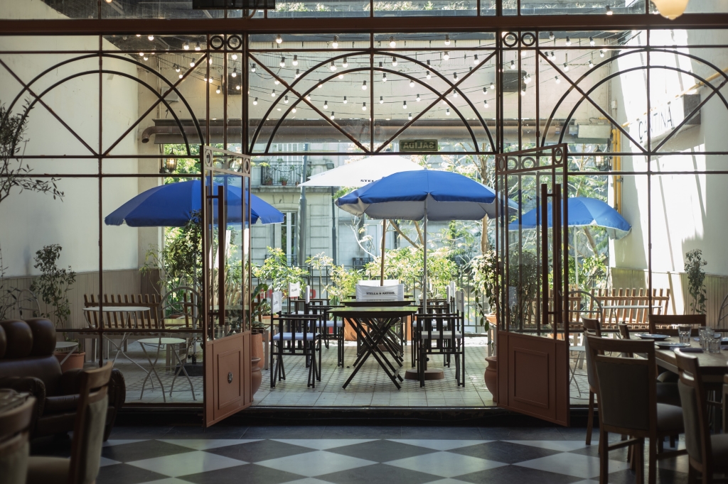 En la planta baja, el salón se divide en dos ambientes: uno íntimo, para compartir entre dos un café o una porción de pastelería, y otro con sillones adosados a la pared y mesas más amplias para grupos de hasta cuatro personas. En la planta alta, otro salón continúa la línea estética con mesas y sillas a juego, complementado por una terraza semitechada que ofrece vistas a la arquitectura característica de la avenida, iluminada por pequeñas luces que le otorgan un toque acogedor. Este espacio exterior se completa con banquetas de madera, sombrillas y plantas, creando un entorno ideal para disfrutar de un café, un vermouth o una copa de vino.