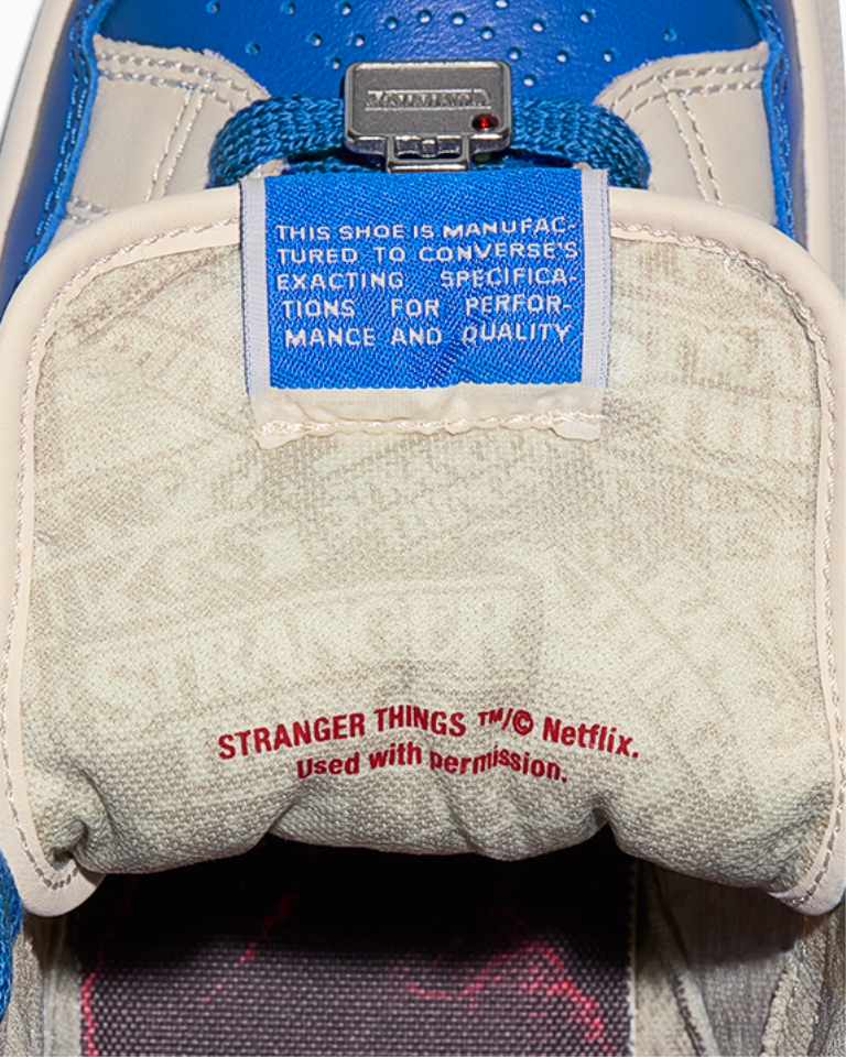 Las Converse Weapon cuentan con una nueva combinación de colores inspirada en las Weapon originales del catálogo de 1984, así como una parte superior de piel premium con capas inferiores desgastadas que recuerdan la estética vintage de la época. Los detalles personalizados, como un forro con gráficos inspirados en el periódico de Stranger Things, perforaciones en la puntera que recuerdan a ondas de sonido y estampados en la plantilla de El azotamentes, sumergen a la comunidad de fans en el mundo de Hawkins. Entre los toques únicos se incluyen una etiqueta del mundo al revés en la lengüeta y adornos como una tartera o una señal de grabando, además de dos juegos de cordones personalizables.