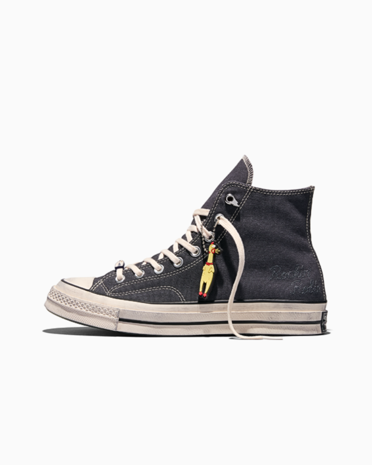 El logotipo de la emisora de radio y el forro con estampado con el texto «Beam Me Up, This Place Sucks» son un guiño a la icónica camiseta de Robin. Otros detalles incluyen un adorno para los cordones de Hawkins Hawk, un llavero con forma de pollo de goma, la estrella del Demogorgon en el parche de las Chuck y el nombre de los jugadores de los Hellfire Club estampado en el forro de la lengüeta. Cada par incluye dos cordones personalizables y una matrícula del Mundo del revés.