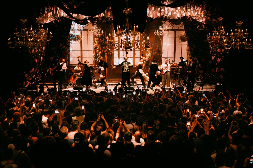 La puesta en escena fue uno de los grandes protagonistas del fin de semana: el C se transformó en un salón de terciopelo rojo, arañas antiguas y una estética barroca que remitía directamente al universo visual de Barry Lindo, su nueva canción. A ese clima teatral se sumó la presencia de bailarines en distintos momentos del show, reforzando el carácter performático y lúdico que atraviesa la propuesta de la banda.