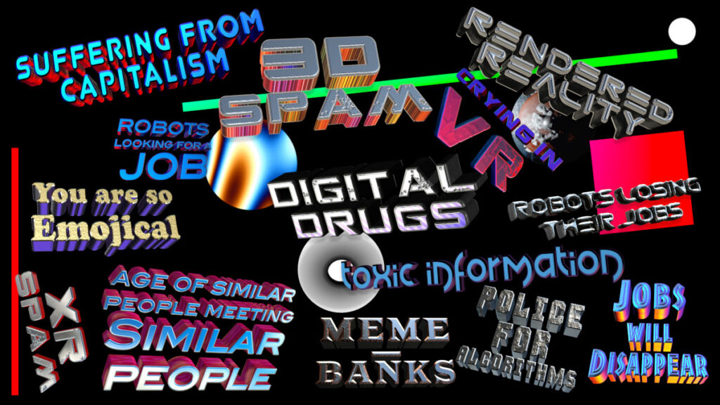 La segunda obra central es Content Indiferrence, un proyecto iniciado en 2019 y presentado en diversos contextos internacionales, entre ellos Aperto Raum Berlin como parte de Vorspiel / transmediale & CTM. En esta ocasión, la obra se exhibe en una nueva adaptación desarrollada especialmente para Artlab. Content Indiferrence funciona como un archivo dinámico de frases, conceptos y consignas que emergen de manera azarosa en un entorno tridimensional de estética deliberadamente obsoleta, cercana a los primeros lenguajes gráficos del 3D de los años 2000. El trabajo aborda de forma irónica y crítica la vida contemporánea atravesada por la hipercomunicación, el consumo de información y la naturalización de imaginarios tecnológicos, poniendo en escena un universo donde el exceso de signos produce una experiencia de saturación y extrañamiento.