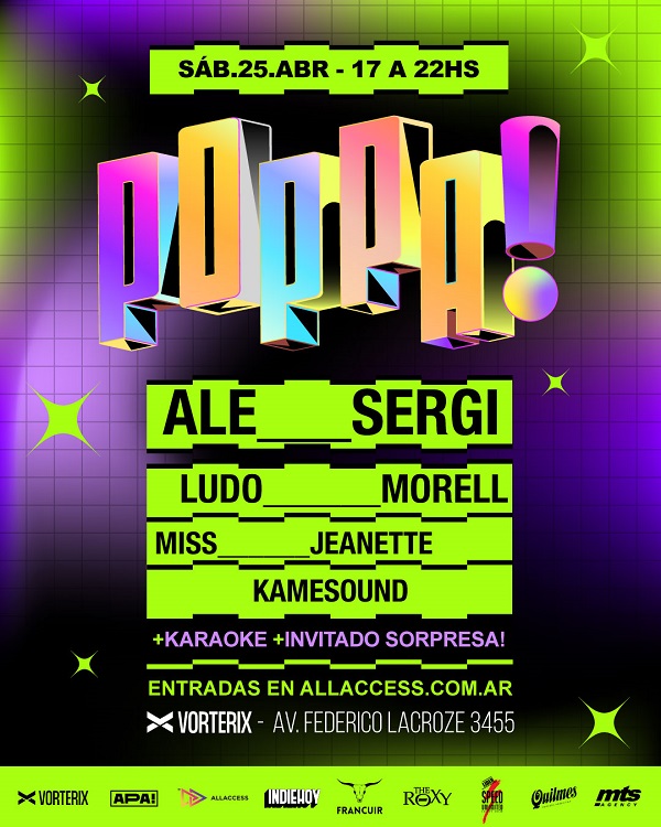 Este sábado 25 de abril de 17 a 12 y para todo público, Fiesta Poppa! llega al Teatro Vorterix con su crew completa por primera vez: el aclamado Ale Sergi se sumará como DJ headliner con un set especial, llevando su propio recorrido por el universo Pop, junto a Ludo Morell, Miss Jeanette y Kamesound.
