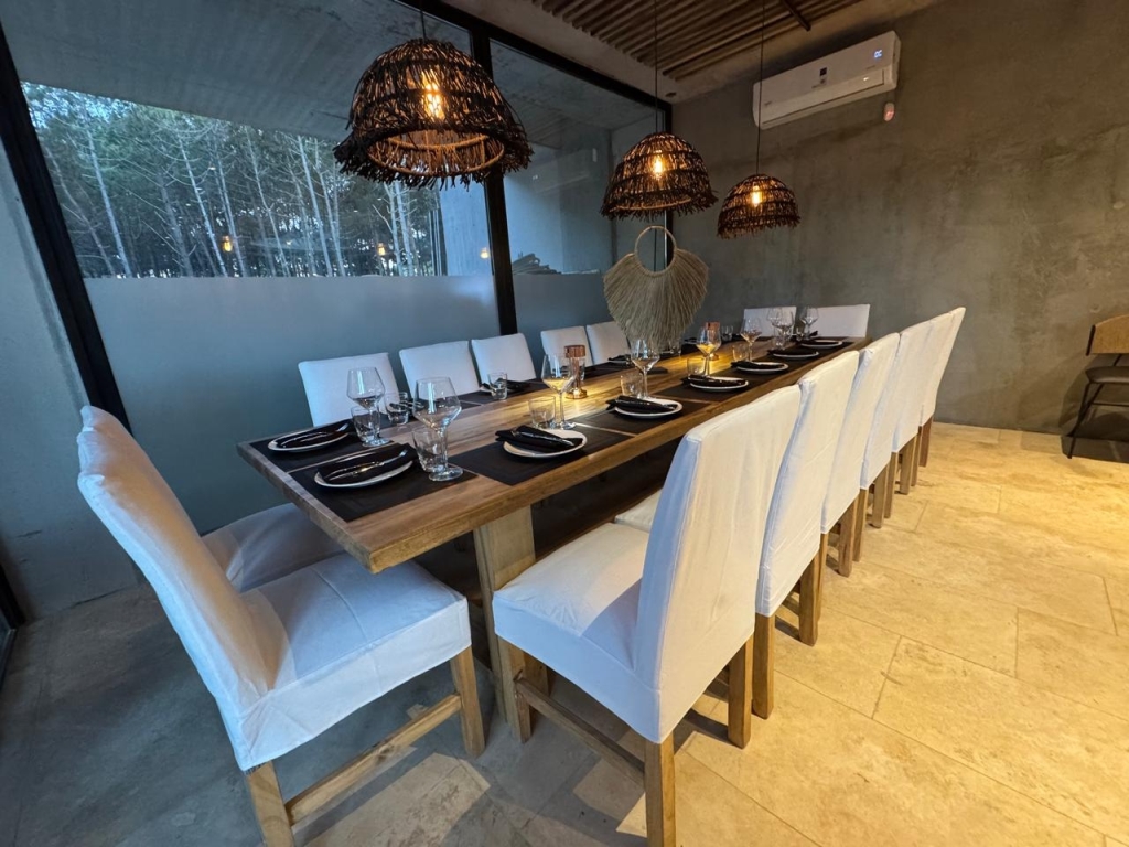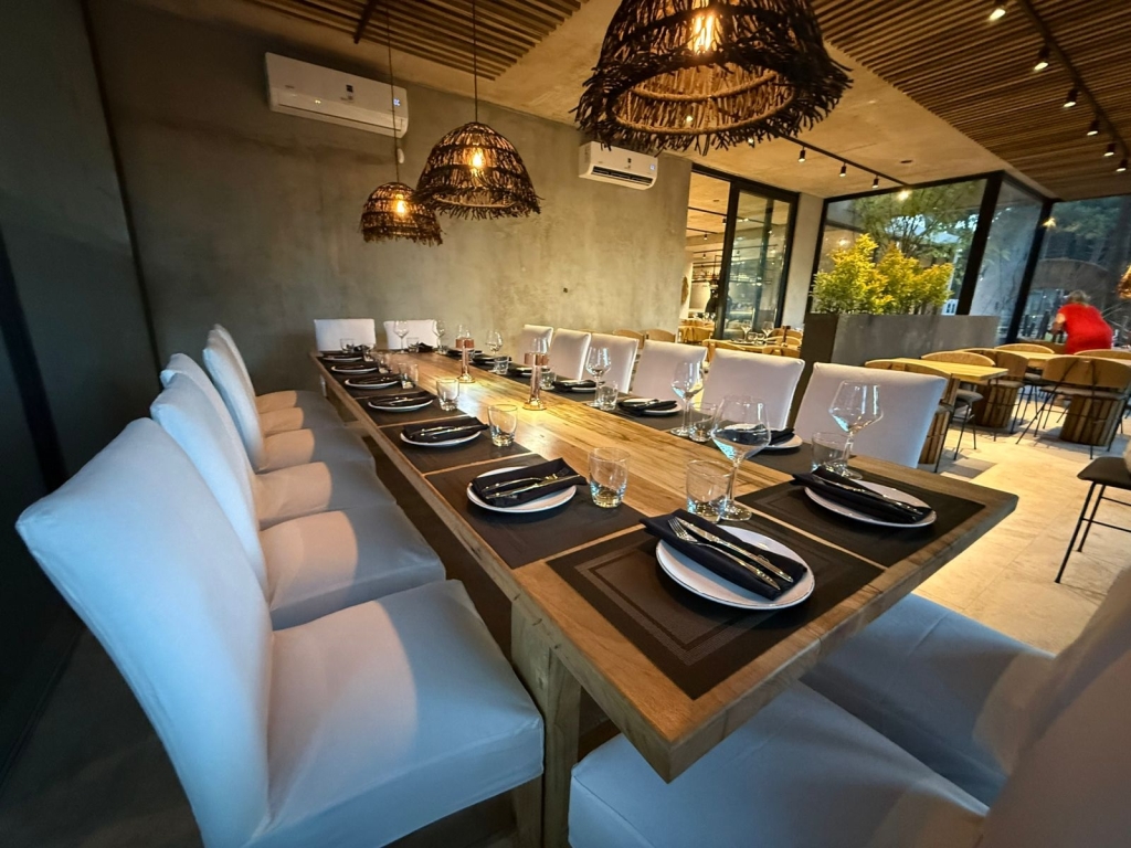 El proyecto está organizado en tres sectores que funcionan como escenarios de distintas experiencias. La playa simulada propone arena, barra propia y un ambiente ideal para disfrutar del after beach. La galería semicubierta actúa como transición y suma un VIP para 16 personas destinado a degustaciones y encuentros privados. El salón principal ofrece un ámbito pensado para cenas, presentaciones corporativas y propuestas de nivel. Cada sector integra elementos naturales, fibras, madera y diseño boho chic que acompañan la identidad del espacio.