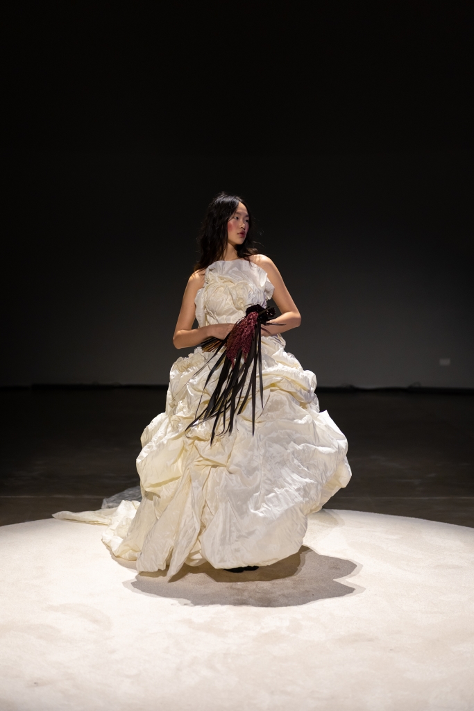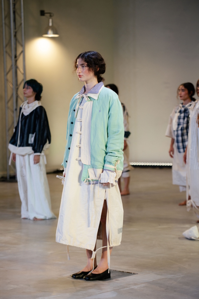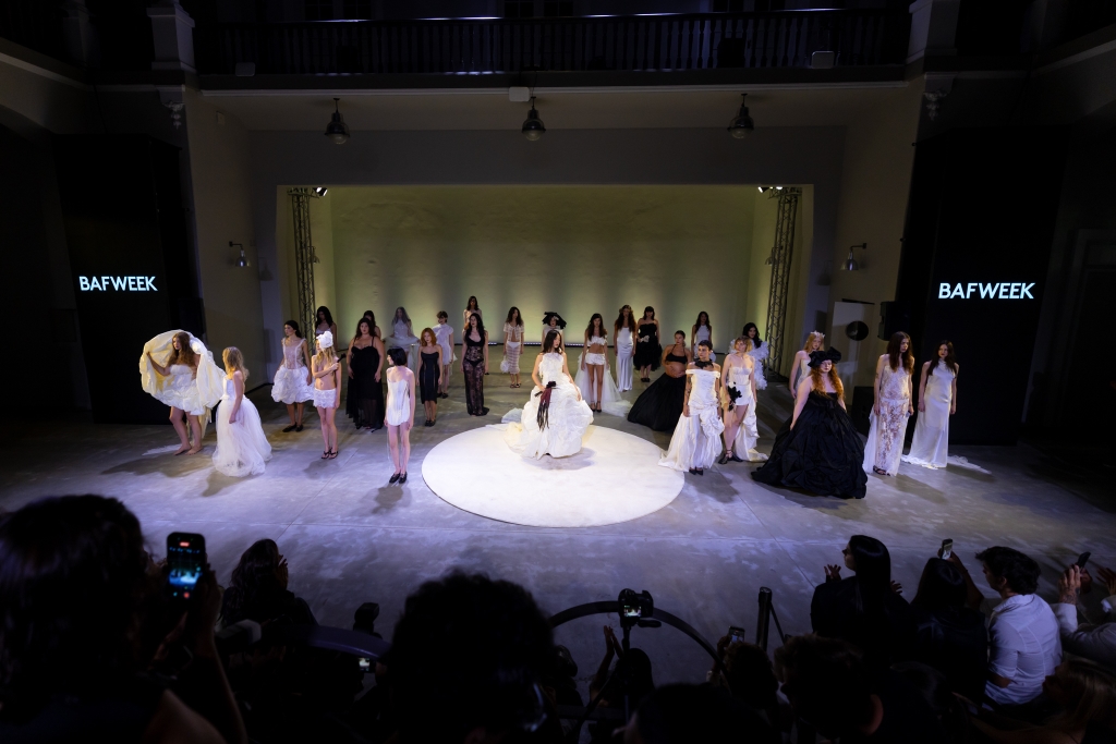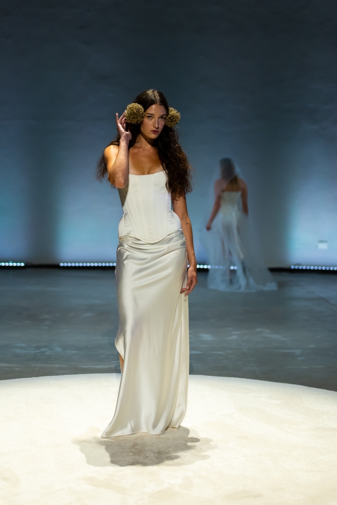 Más tarde, fue el turno de Valentina Schuchner y su colección «Lo siento mucho», donde explora el blanco como construcción histórica y símbolo de feminidad. El desfile propuso un recorrido cíclico con 28 modelos representando los 28 días de un ciclo femenino: sedas, gasas y corsetería dieron vida a una puesta que osciló entre la calma y la ruptura, ofreciendo una mirada crítica y contemporánea sobre el cuerpo de la mujer.