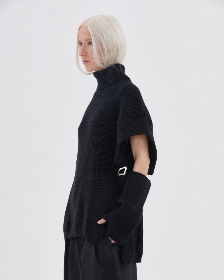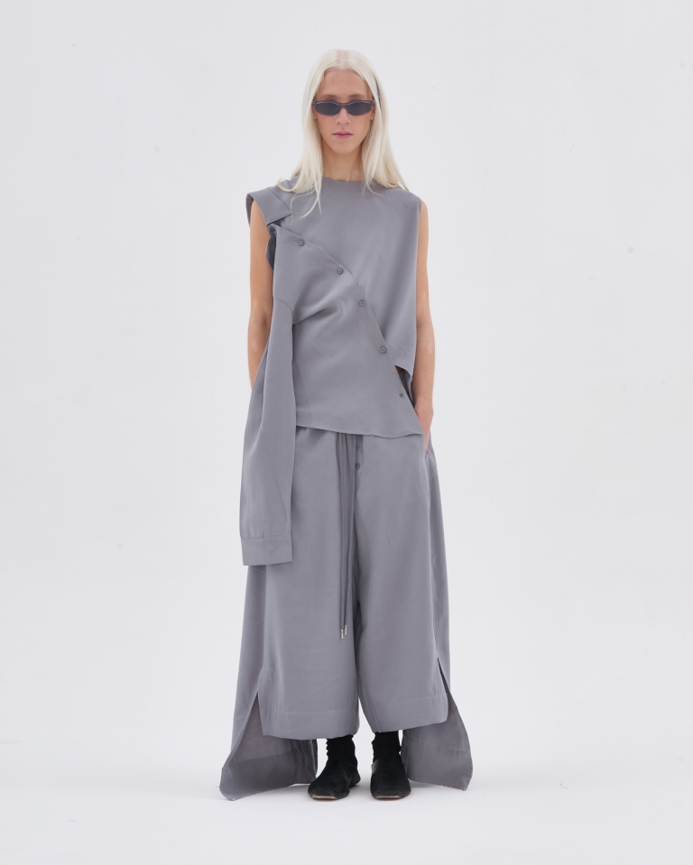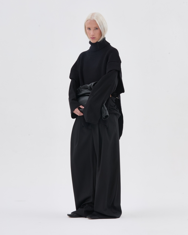 La estructura. Pensamos cada prenda como si fuera una arquitectura que se habita. En ese sentido, lo que nunca puede faltar es una mirada constructiva: cómo se sostiene la prenda, cómo se vinculan sus partes, cómo se transforma en el cuerpo. Empezamos por la moldería, por los cortes, por los ensambles. No diseñamos desde el ornamento, sino desde el esqueleto, desde la lógica interna que le da sentido a la forma. Después llega el gesto, el volumen, la emoción.