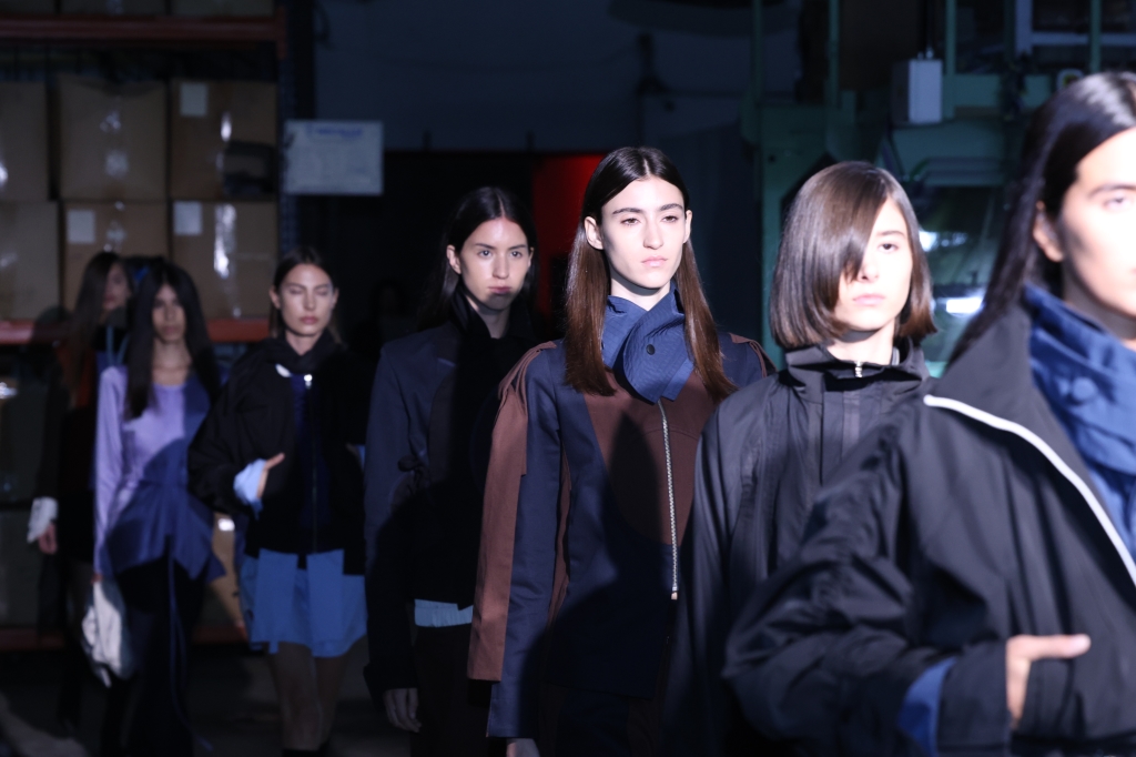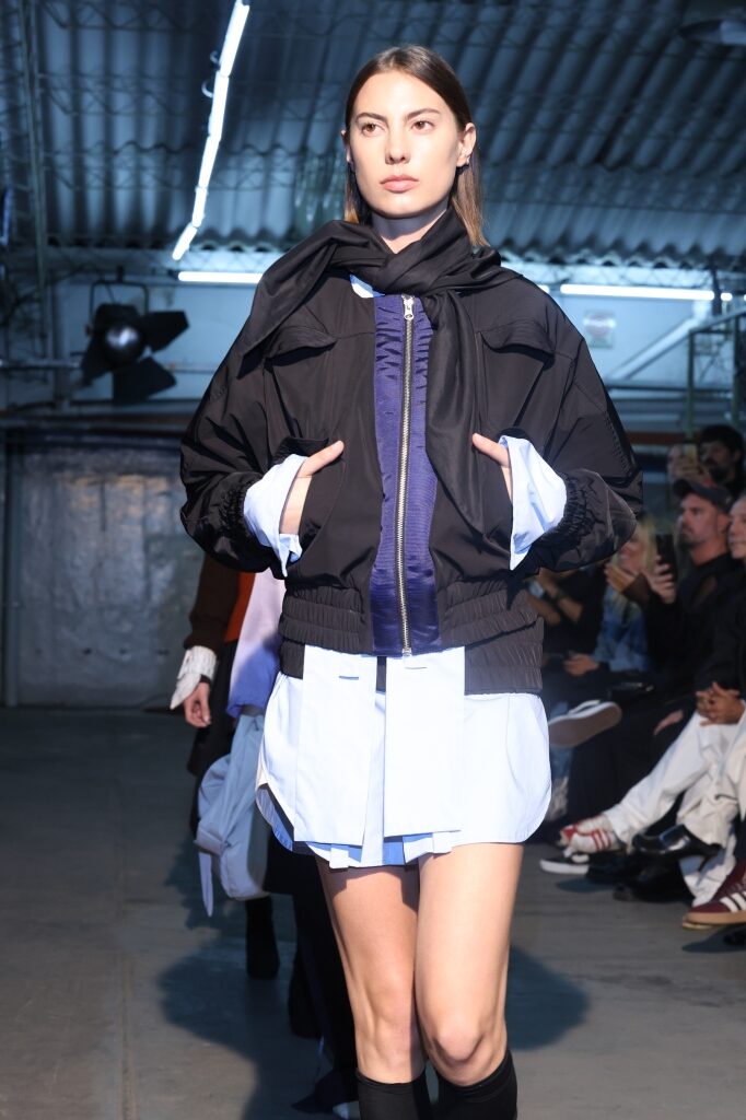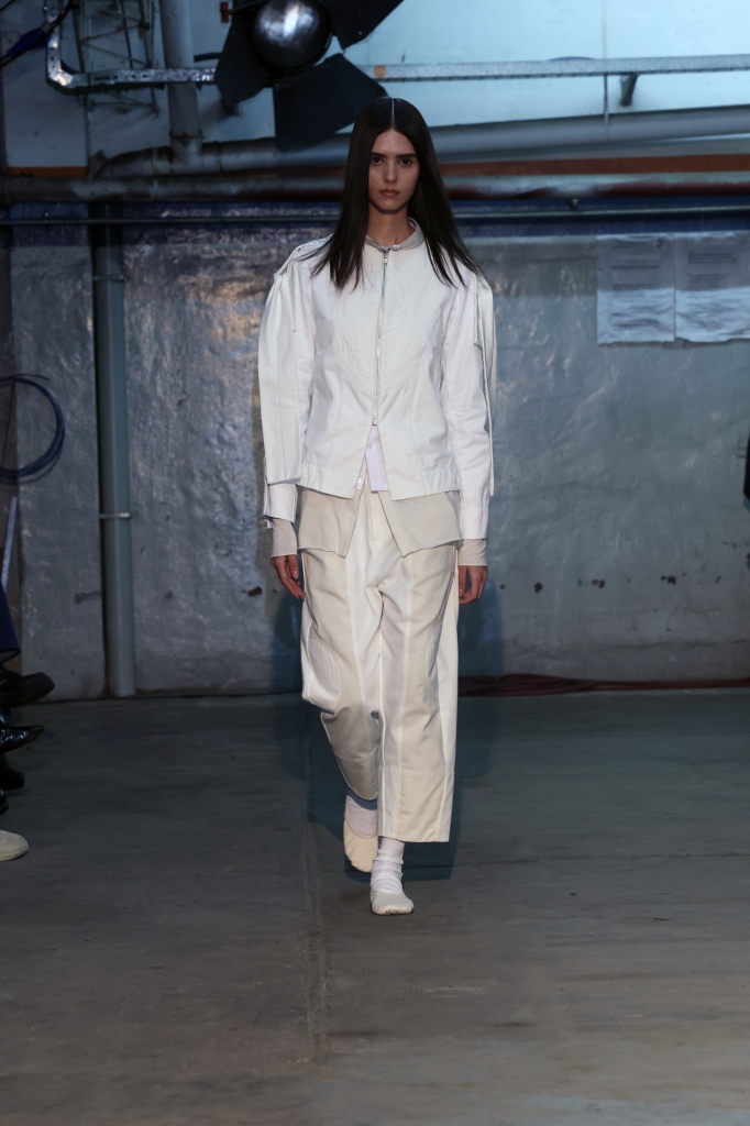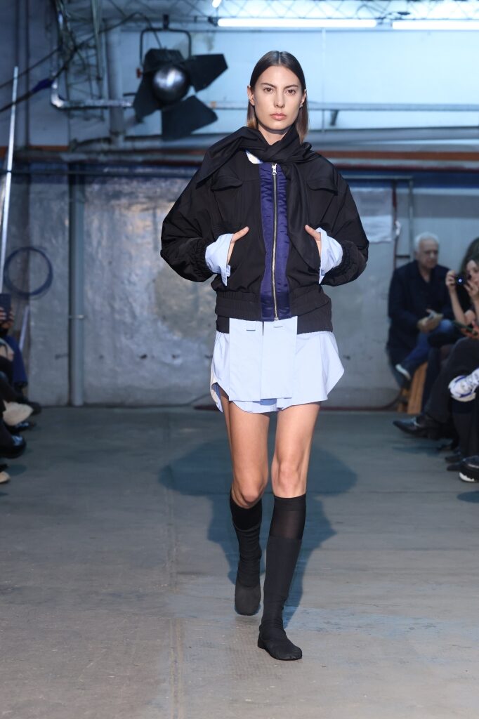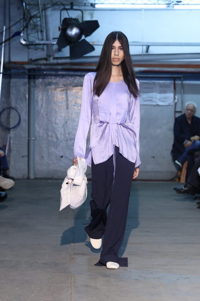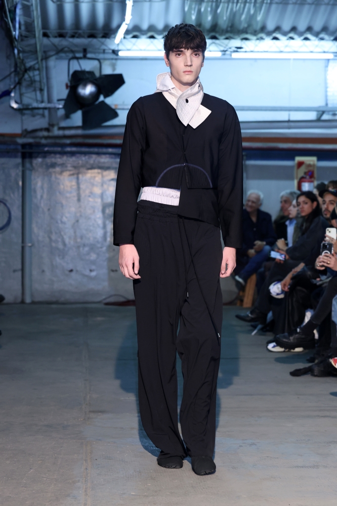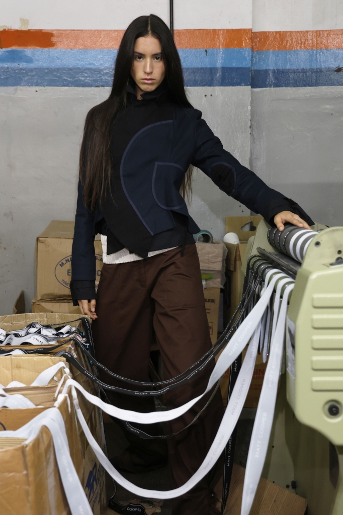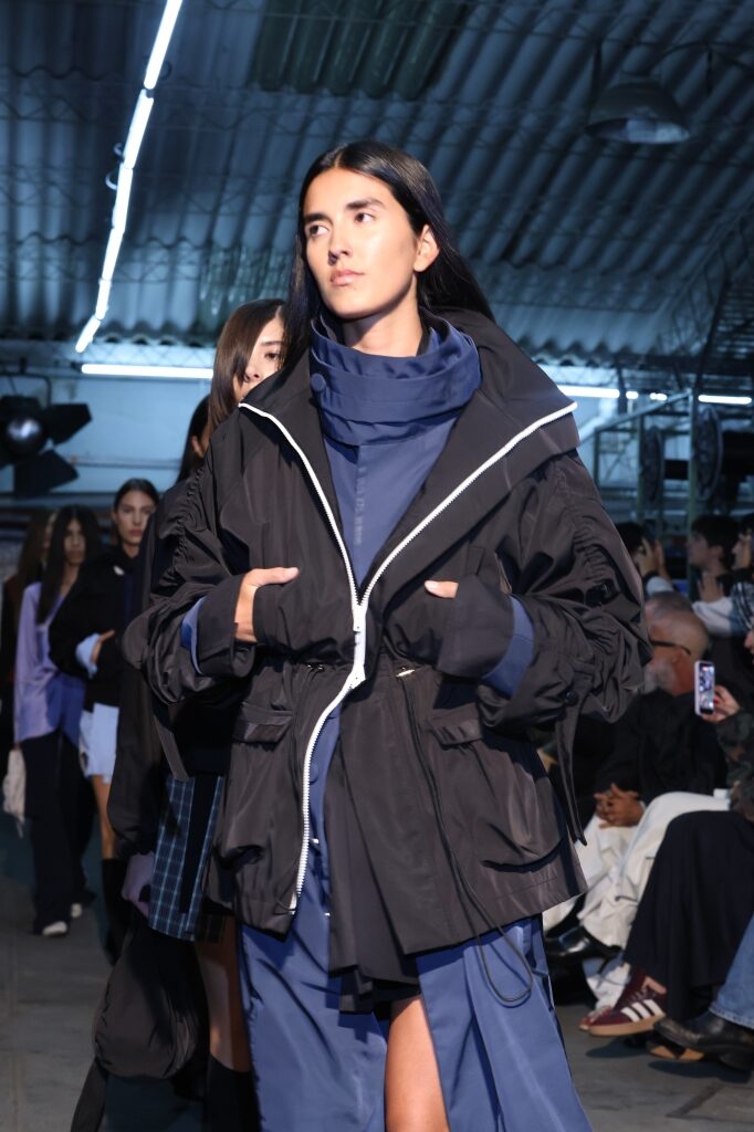 JT exploró la silueta a través de conjuntos de dos piezas en mimesis absoluta, presentes tanto en gabardinas clásicas como en denim. Los textiles evolucionaron hacia materiales técnicos e impermeables, pensados para la performance y la libertad de movimiento, incorporando elásticos super anchos y frunces extremos en cuellos y cinturas que enfatizan la tensión entre control y expansión.