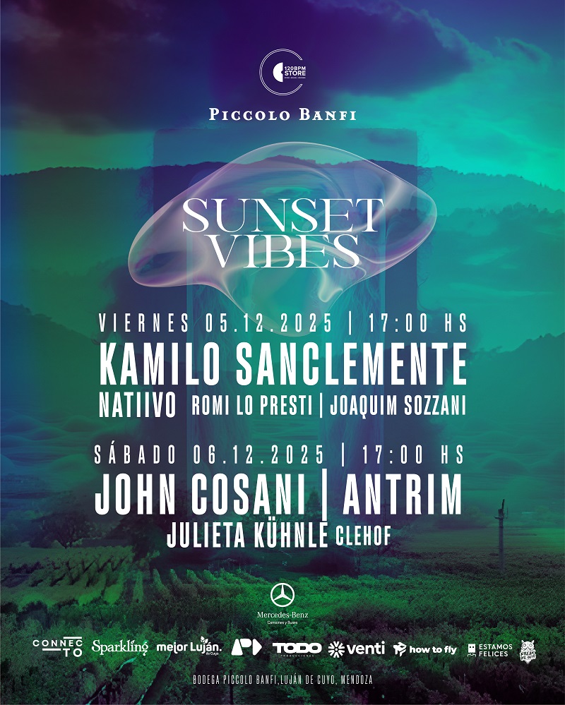 Rodeada por 25 hectáreas de viñedos y con la vista más buscada del Cordón del Plata, la bodega se vuelve parte del escenario y del sonido. Sunset Vibes es co-organizado por Bodega Piccolo Banfi, 120bpm Store y la agencia Connecto, en una construcción conjunta que pone en primer plano el paisaje, la música y el clima del encuentro.