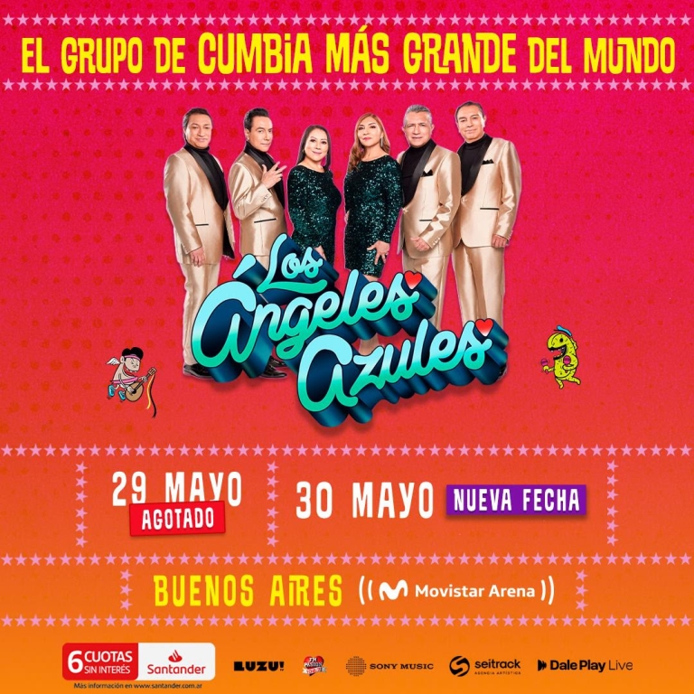 Tras el gran éxito de su anuncio y la enorme respuesta del público, Los Ángeles Azules confirman una segunda fecha en Buenos Aires y suman un nuevo show el 30 de mayo, ampliando su gira por la Argentina. Reconocidos por hits que marcaron a todo el continente —como “Cómo Te Voy a Olvidar”, “El Listón de Tu Pelo”, “La Hice Llorar” y “20 Rosas”— la agrupación llega con un espectáculo que pone al frente sus clásicos y la energía festiva que los convirtió en protagonistas del fenómeno global de la cumbia romántica. Con millones de seguidores en todas las generaciones y colaboraciones con artistas de distintos géneros que renovaron su propuesta sin perder identidad, la banda se reencontrará con el público argentino el 27 de mayo en Rosario, el 29 y 30 de mayo en Buenos Aires y el 31 de mayo en Córdoba.