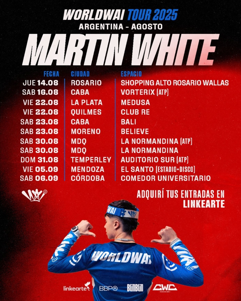 Martin White, el fenómeno chileno que revolucionó la guaracha urbana, regresa a la Argentina junto a BlinBlin, la fiesta urbana por excelencia, con una gira que promete desatar una verdadera fiesta. Su gira WorldWai Tour 2025, lo llevará a presentarse en varias ciudades de norte a sur, incluyendo su esperadísimo show en el emblemático Teatro Vorterix de Buenos Aires el sábado 16 de agosto.