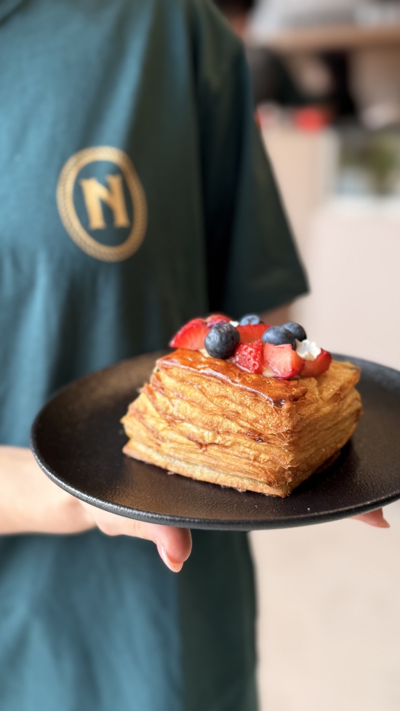 Al mediodía, propone una experiencia especialmente pensada para el almuerzo, con tres platos exclusivos disponibles de 12 a 16 h, a elegir entre la tarta del día servida con ensalada de hojas verdes y pickle de cebolla, milanesa de peceto con tallarines salteados en manteca de limón y hierbas, o berenjena asada con hummus, pasatta de tomates queso sbrinz. Este menú convive con una carta que, a lo largo de todo el día, exhibe también una cuidada selección de sándwiches, tostados y un par de ensaladas, ideales para disfrutar en cualquier momento. Entre los destacados se encuentran el sándwich de pastrón con mostaza de Dijon y cebolla caramelizada, y el clásico sánguche de milanesa, servido entre panes con alioli, rúcula, tomate confitado y pickles de cebolla morada y pepinos.