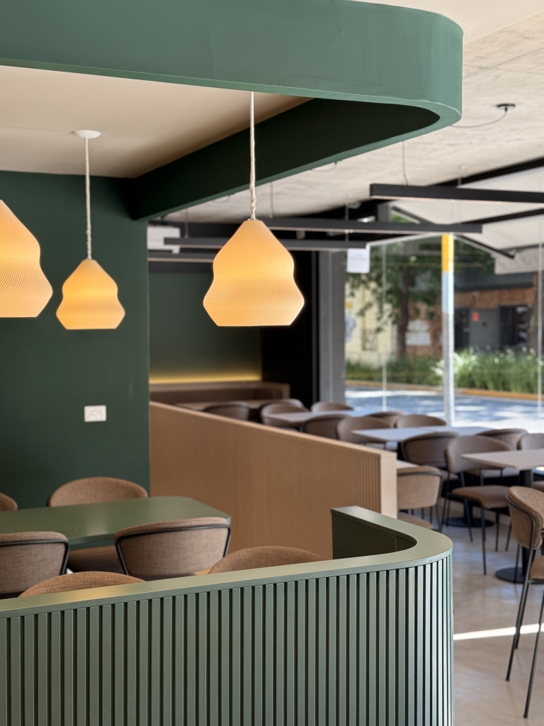 El espacio se distingue por una estética moderna y cuidada, donde predominan los tonos verdes y negros, el mobiliario textil en color castaño y líneas simples que aportan elegancia y confort. Gracias a su fachada completamente vidriada, la luz natural atraviesa el salón durante todo el día, generando un ambiente relajado y acogedor. Una barra de gran protagonismo organiza la dinámica del lugar: desde allí se despachan cafés de especialidad, vinos y vermut, invitando tanto a una pausa breve como a una estadía más prolongada.