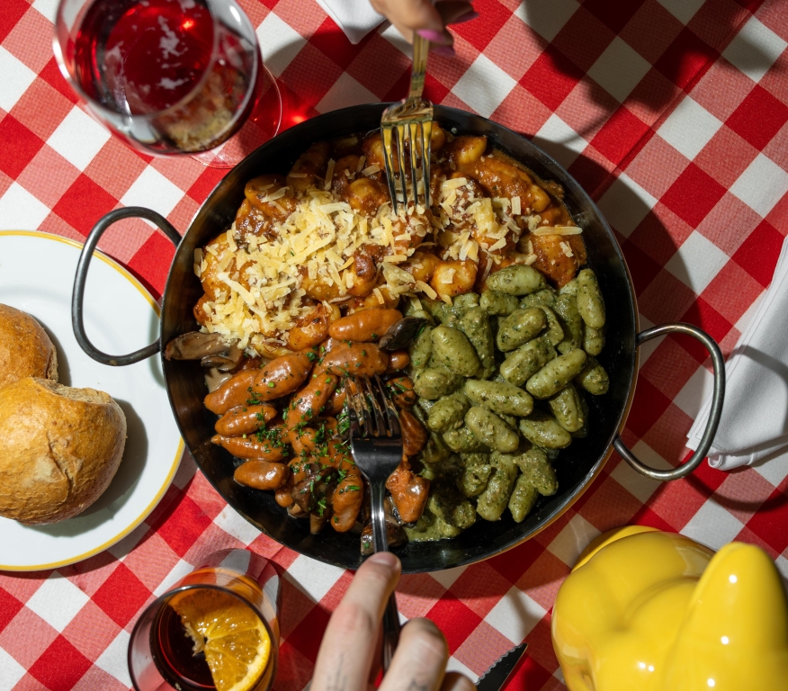 En la sección de principales, las carnes se presentan con cortes como bife de chorizo, asado banderita, costillitas de cerdo a la riojana y carne al horno de larga cocción —hasta 10 horas— que se desarma al servir, junto a opciones de pescado como la trucha a la manteca. Las pastas caseras también forman parte de la identidad del lugar , con alternativas como ñoquis, cintas, sorrentinos de jamón y mozzarella y ravioles de ricota y espinaca, combinables con salsas como tuco, estofado, pesto o crema de hongos. Cada 29, los ñoquis se presentan en formato especial tipo “picada” (albahaca, papa y morrón asado), acompañados por salsas pesto, fileto y de hongos, además de panera y dos porrones de cerveza tirada. La carta se completa con risottos —como el de hongos o el de calabaza con queso azul—, guarniciones y ensaladas.