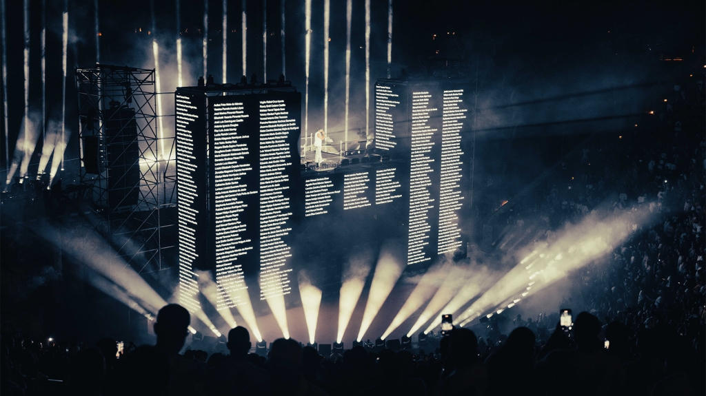La imponente puesta audiovisual se fusionó de manera perfecta con la performance imbatible de Carrión, y durante más de dos horas de espectáculo el público fue sumergido en un viaje sensorial extraordinario. Sin duda, uno de los momentos más conmovedores y significativos de la noche fue el homenaje a las víctimas de la tragedia en la discoteca Jet Set, una iniciativa creativa concebida cuidadosamente por Eladio y su equipo. Adaptando el escenario en conjunto, se logró dar forma a un momento verdaderamente especial: un minuto de silencio, seguido de la proyección en pantalla de los 236 nombres de las personas que fallecieron el pasado 8 de abril, mientras Eladio interpretaba ‘Guerrero’.