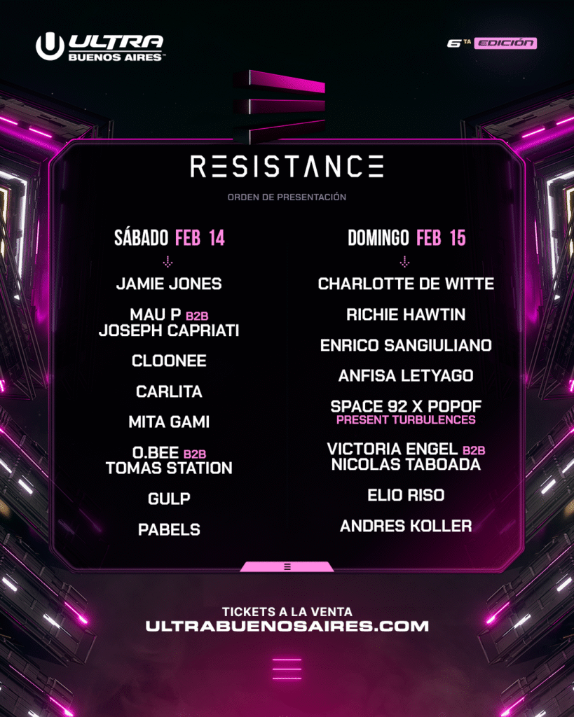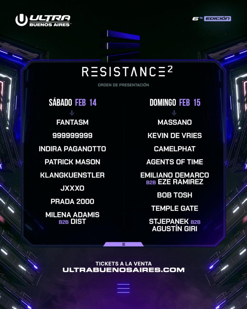 El escenario RESISTANCE 2 ofrecerá una experiencia underground complementaria en ULTRA Buenos Aires 2026. El sábado, la programación estará enfocada en el hard techno, con presentaciones de Fantasm, 999999999, Indira Paganotto, Klangkuenstler, Patrick Mason y Prada2000. El domingo, el protagonismo pasará al melodic techno, con un line up encabezado por Massano, Kevin de Vries, CamelPhat y Agents of Time.