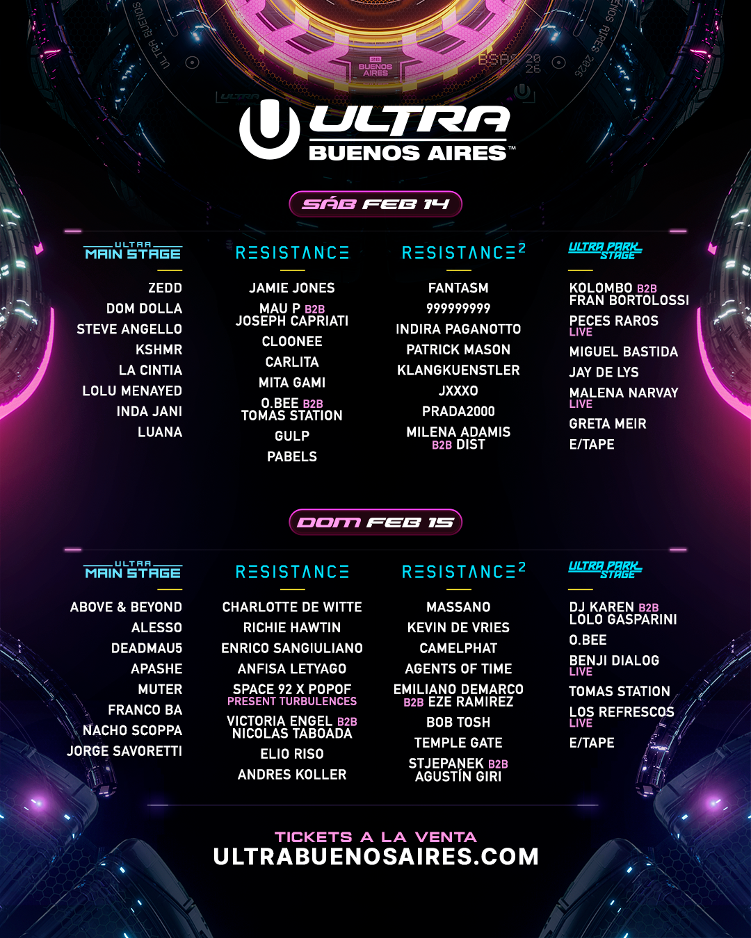 El escenario RESISTANCE 2 ofrecerá una experiencia underground complementaria en ULTRA Buenos Aires 2026. El sábado, la programación estará enfocada en el hard techno, con presentaciones de Fantasm, 999999999, Indira Paganotto, Klangkuenstler, Patrick Mason y Prada2000. El domingo, el protagonismo pasará al melodic techno, con un line up encabezado por Massano, Kevin de Vries, CamelPhat y Agents of Time.