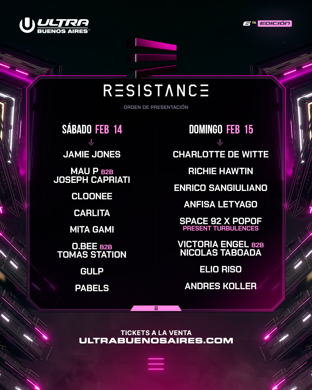 Por su parte, RESISTANCE, la reconocida marca underground de ULTRA Worldwide, contará con dos escenarios dedicados a lo más destacado del house y el techno de vanguardia. El sábado, el primer escenario RESISTANCE presentará una propuesta orientada al house con artistas de groove marcado como Jamie Jones, Joseph Capriati b2b Mau P, Cloonee, Mita Gami y Carlita. El domingo, el escenario se enfocará en algunos de los máximos exponentes del techno a nivel mundial, con Charlotte de Witte, Richie Hawtin, Enrico Sangiuliano, Anfisa Letyago y Space 92 b2b Popof presents Turbulences al frente de la programación.