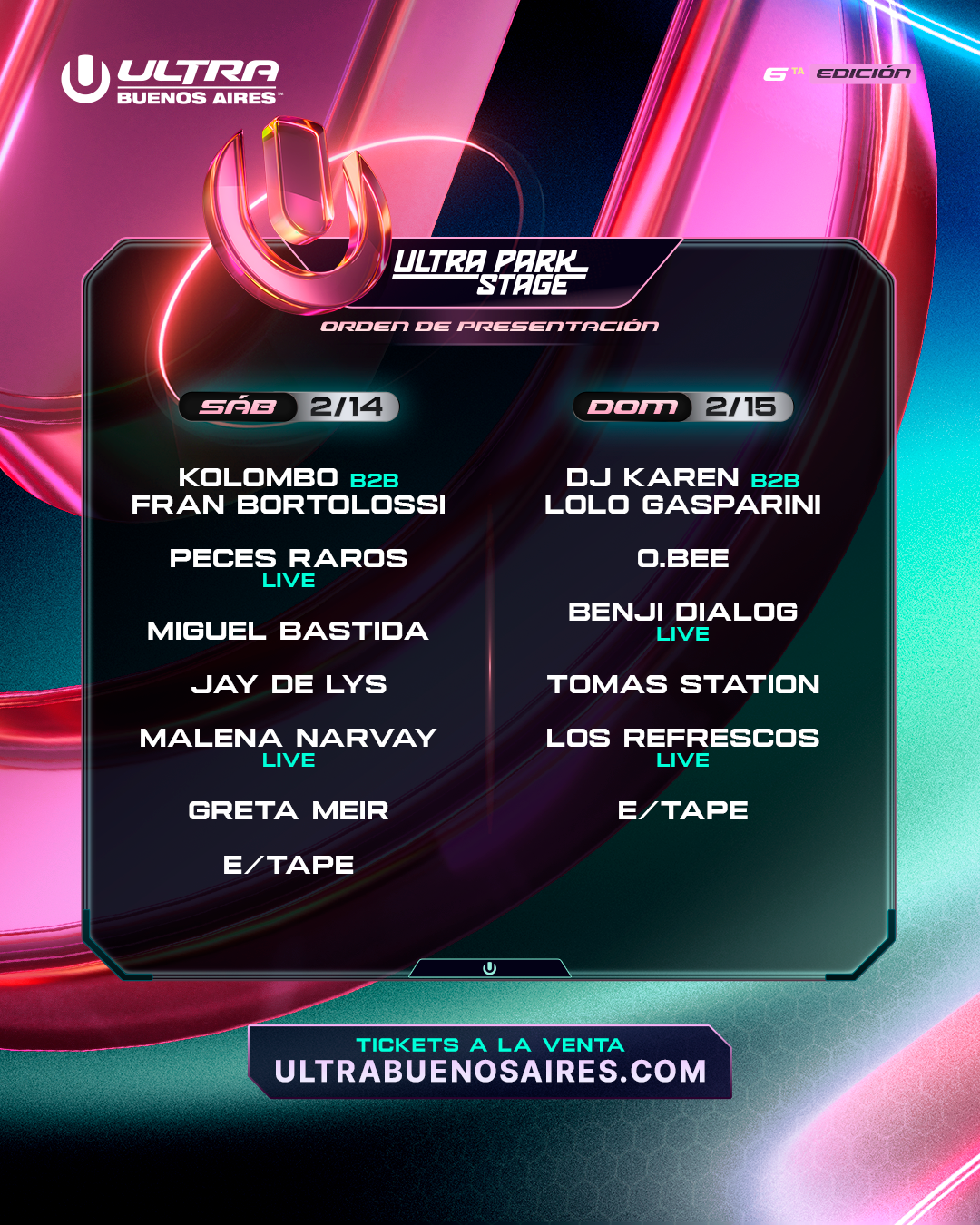 Finalmente, ULTRA Park Stage será el espacio dedicado a destacar nuevas corrientes y propuestas clave dentro del festival. A lo largo del fin de semana, el escenario contará con artistas como Peces Raros (Live), Malena Narvay (Live), Benji Dialog (Live), Kolombo b2b Fran Bortolossi y Miguel Bastida, entre muchos otros, consolidando a ULTRA Park Stage como un punto clave para descubrir el pulso creativo dentro del festival.